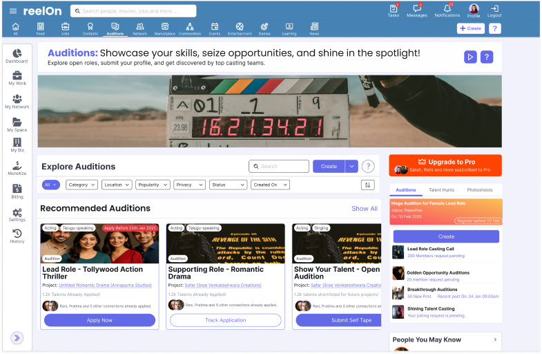 Bitla Media Works helps artists build strong careers and supports production houses, casting agencies, creators and event hosts with casting, crew, shoot planning, workshops and more. Everything runs on reelOn, making the process smoother and faster.
